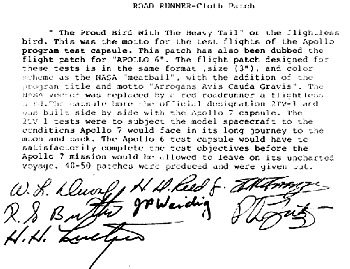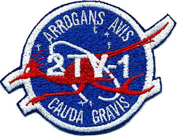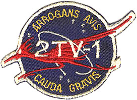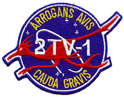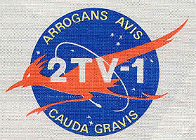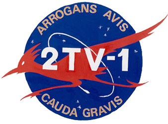 The crew had designed their own mission patch, wich was worn on their spacesuits during the test. It resembled the NASA "meatball" insignia, and featured a roadrunner as well as the Latin phrase "Arrogans Avis Cauda Gravis". The roadrunner was a Texan bird, perhaps best known as a cartoon character that was perpetually chased across the dessert by Wile E. Coyote. It was symbolic for the period 1967-68 during wich the pace of work at NASA was ver fast. More importantly: it didn't fly, making it a perfect symbol for 2TV-1. The Latin phrase was a reference to the slogan "The Proud Bird With The Golden Tail", that Continental Airlines used during those days to describe their fleet. "Arrogans Avis Cauda Gravis" means "The Proud Bird With The Heavy Tail", again emphasising that 2TV-1 was not going anywhere.