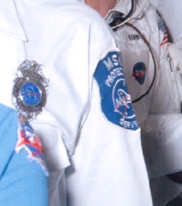 Right:Two versions of the patch. The beta cloth is on Joe Kerwins suit, the embroidered patch is on the arm of a suport person.