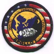 Most commonly seen are these two versions of the Apollo-1 patch. Shown at left is the Lion Brothers version, which closely follows the artwork but has a yellow border. The AB Emblem version resembles the official patch (produced by Stylized Emblem Co. of Hollywood, Calfornia) shown at the top of this page. The AB-emblem version can be recognized, however, by the silver mylar used in the moon. Some people say the yellow border patch is the official patch and the black border was added after the fire. This is not true: on all phothographs taken with the crew on it, the crew wears the black border patch. Shown below is a 3 inch souvenir version.