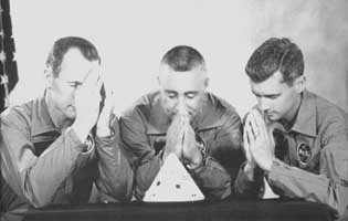 ![]() These two photo's of the Apollo-1 crew were taken on April 1, 1966 during the official crew photo sitting. (The official Apollo-1 crew photo S66-30236 was taken on April 1, 1966, so I presume that these two funny photo's were also taken on that date). The "praying hands photo" was given to Joe Shea by Gus Grissom and signed by all three crewmembers with the phrase: "It isn't that we don't trust you, Joe, but this time we've decided to go over your head". The First manned Apollo mission was scheduled for launch in late February 1967. During the "plugs out" test on January 27, 1966 a fire broke out that killed the crew.