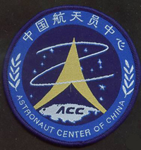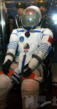 Zhai Zhigang's spacesuit displaying the mission patch and the Astronaut Center of China.
