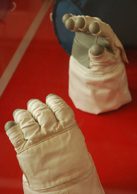 Left; Zhai Zhigang working outside the Shenzhou-7 OM on China's first EVA. Note the yellow 'Feitian' patch on his shoulder (see original, heavily embroidered patch below). Right: Liu Buoming assists Zhai, wearing the Russian-provided Orlan suit. Note the Shenzhou-7 patch on his shoulder). Both suits were left inside the OM before the crew landed; only the gloves of Zhai's EVA suit were returned to Earth (below right).