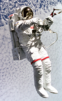 The spacewalking figure seems to be based on a photo taken of Mark Lee during his STS-64 spacewalk, testing the SAFER unit (shown right).