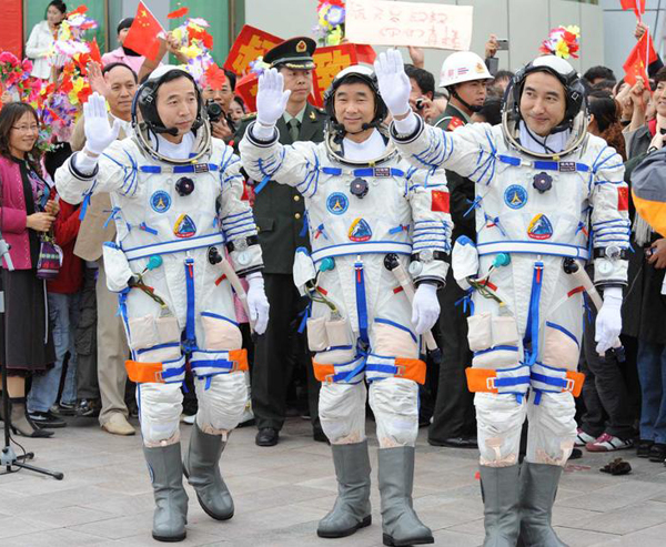 The Shenzhou-7 crew of Jing Haipeng, Liu Buoming and Zhai Zhigang leaving for the launchpad.