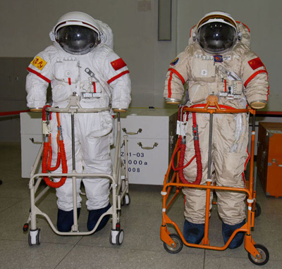 Left: the two suits used during the EVA; the Chinese 'Feitian' (which means 'flying in space') suit and a Russian-made Orlan; right; Zhai's suit at an exhibition in October 2008.