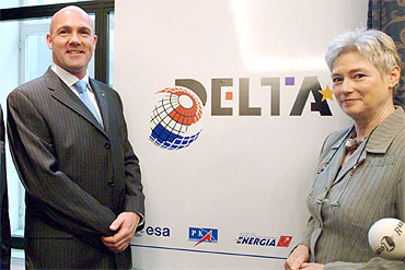 (6 November 2003) - The Dutch Ministers for Economic Affairs and for Education, Culture & Science have announced the mission name of the next Soyuz flight to the International Space Station. This mission has been christened "DELTA". Flanked by Kuipers, Minister Van der Hoeven unveiled the mission logo.