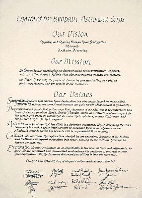 The Charta of the European Astronaut Corps, as signed by the astronauts on 15 August 2001.