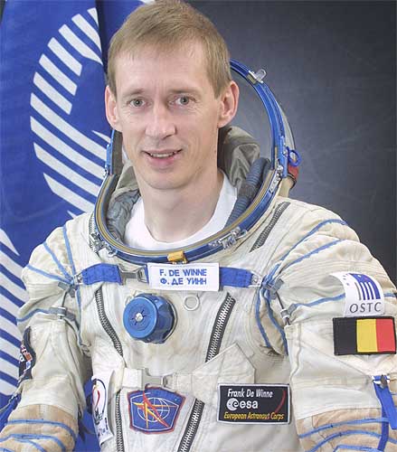 Born in Ghent, Belgium, 25 April 1961. In January 2000, Frank De Winne joined the European Astronaut Corps of the European Space Agency, whose homebase is the European Astronaut Centre in Cologne, Germany. From 30 October to 10 November 2002, De Winne participated in the Odissea mission, a support flight to the ISS. He served as flight engineer on the updated Soyuz TMA-1 spacecraft during ascent, and on Soyuz TM-34 during reentry.