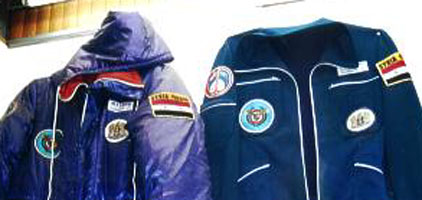 Left: The Sokol suit of Syria's back-up cosmonaut Menir Habib. This is the earliest example of a second generation Mir-patch attached to a Sokol-suit. It yet had to make its flight debut during Soyuz TM-4. Right: Habib's cold weather survival and PK-14 suits.