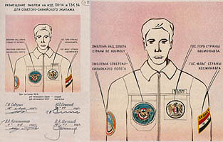 In addtion to the mission patch on the right sleeve of their PK-14 jackets and Sokol-suits, the Russians were wearing a CCCP-flag on their left sleeves (silk type, rounded lettering on PK-14; fully embroidered on Sokol), a Soviet seal on the left chest and a cyrilic Interkosmos-patch on the right chest. On the front of their Sokols, all three had an additional first generation Mir-patch.