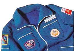The mission patch was worn on the right sleeve of the Sokols (on the right chest in pre-flight pictures). A fully embroidered CCCP-Flag patch with rounded letters was worn on the left sleeve by the Soviet cosmonauts and the Afghan Flag patch with the Cyrillic letters 'PA' ('RA', Afghanistan Republic) on the left sleeve of Ahad's Sokol. Ahad was also wearing an Afghan seal, which, like the seal on the Soviet suits, was worn on the left chest. A second generation, stylized Mir-patch was worn on the front of the suit by all three cosmonauts.