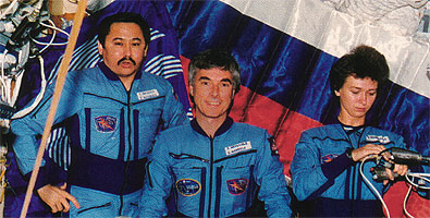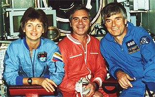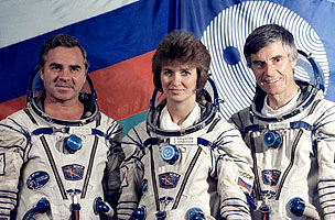![]() Left: Viktorenko, Kondakova and Merbold in their trainign Sokols. Right: The crew in their training IVA suits. Note Kondakova's personal Molchanov patch and Merbold's "Russian" Esa-patch. Mission