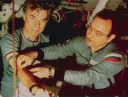 ![]() Left: EO-16 crewmember Musabayev with TM-20 cosmonauts Merbold and Kondakova. Right: Merbold was wearing a red-bordered Zvezda-patch on his Penguin suit. ![]() Left: Viktorenko in his underwear pictured with Kondakova in Penguin suit. Right: TM-20 cosmonaut Merbold in underwear, examined by EO-15/16/17 crewmember Polyakov.