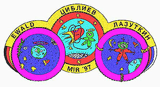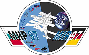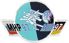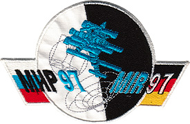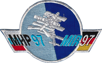 Left: The Mir-96 design, embroidered by Stewart Aviation. Right: An early version of the Mir-97 emblem. Like other international missions, the Mir-97 logo was adopted as the official mission patch and worn on the flight Sokols during launch and landing. Innitially, the mission was planned for 1996, so the German program was called Mir-96. We have only seen the design of the Mir-96 logo as a Stewart Aviation souvenir patch, which was derrived from a printed version. This version, which included a Leonardo Da Vinci symbol, a scientific drawing and the Earth, was made into a Mir-97 logo by simply changing the 96 for a 97. This version was made available in embroidered form as well, excluding the Earth to make the patch look less crowded. Although this design was aboard on a series of flags, it was not the version that was flown on the Sokol and IVA suits. The black and white background was replaced by two shades of blue and the Leonardo Da Vinci and scientific symbol were left out.