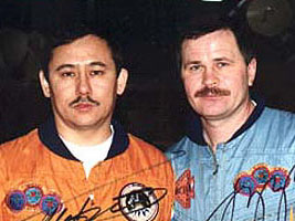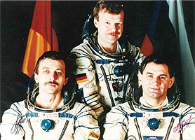Left: The embroidered Soyuz TM-25 crew patch. Right: The backup crew of Talgat Musabayev and Nokolai Budarin wearing the patch. This mission not only had a "scientific" mission logo, but also a Soyuz crew patch. This probably was an innitiative of DLR, along the same lines as the patch for Klaus Detrich Flade's Soyuz TM-14 mission. Like the TM-14 crew patch, it was available in both a primary (Tsibliev, Lazutkin, Ewald) and a backup variant (Musabayev, Budarin, Schlegel). It was designed by an artist named Andorea and consisted of three colorful circles, with children's drawings. It was the first TM-25 / EO-23 patches that was spotted - both the primary and backup crew were wearing it during training.