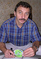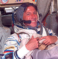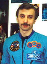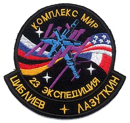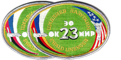 Left: The two versions of the Aviation Patch Supplies patch. Right: Lazutkin showing the patch. When the crew of Soyuz TM-25 faced the press a few days before their mission, Tsibliev and Lazutkin could be seen wearing another EO-23 patch, bearing the flags of the participating countries in this mission, but only their names. It was designed by a new group of Russian spaceflight enthusiasts: Planeta Zemlja. Unlike the Videokosmos/Novosti Kosmonavtiki group, they had succeeded in reaching an agreement with all the parties involved. Secret of their succes was the involvement of RKA Energia cosmonaut Feodor Yurchikin, himself an avid patch collector. Although the Planeta Zemlja patch became the official version, the Novosti Kosmonavtiki/Spaceview patch was much more known to collectors at the time because of Stewart Aviation's involvement. The Planeta Zemlja version was designed by Dmitriy "Dima" Shcherbinin and probably embroidered by the Vimpel company. It uses a black felt background instead of twill.