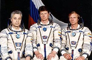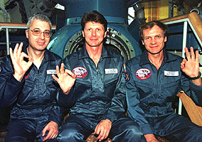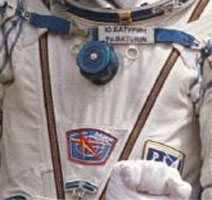 ![]() The crew in their flight Sokols. ![]() Baturin was wearing a new type of Mir patch, produced by Vimpel. It was embroidered on plain blue nylon. It can be easily recognized: the "M" of Mir does not start at the center of the patch, but is off to the right.