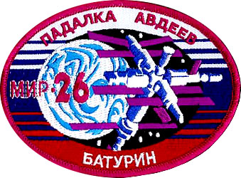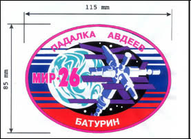 ![]() Left: The artwork by Dmitriy Shcherbinin. Note that the cloud pattern is copied from the Planeta Zemlja Mir-24 patch. Right: The artwork translated into the patch design. For the three previous Mir missions, a patch had been produced by both Planeta Zemlja and by Novosti Kosmonavtiki/Spaceview. When the two met at a Russian air and space fair, they decided to co-operate and take turns in designing patches for the Mir missions. Dmitriy Shcherbinin of Planeta Zemlja would design the artwork for Mir EO-26; Spaceview would take care of the embroidery. As was the case with previous Spaceview patches, they turned to Aviation Patch Supplies. Although the patch was official, it was only worn on the Earth-bound flightsuits.