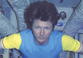 ![]() Left: Padalka in a the colorful outfit. Note the Mir-26 logo in the background. Right: Padalka and Avdeev wearing their Penguin suits near the end of Padalka's stay.