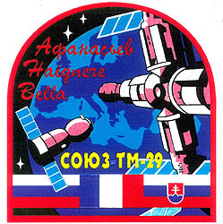 ![]() The crew with their flight Sokols. Note that the TM-29 mission patch is not yet attached.