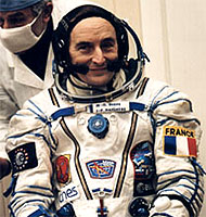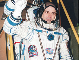 The cosmonauts on launchday. Note that the mission patch is added and that Haigneré has relocated his CNES patch to make room for it. All three cosmonauts were now wearing the newer Zvezda-Mir patch with letter MIR off to the right and embroidered onto blue nylon.