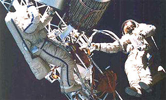 ![]() Left: The spacewalk on July 29, 1999. Both cosmonauts were wearing blue striped Orlan DM-suits: Afanasyev was wearing M-6 and Avdeev was wearing M-4. Right: The reflector experiment.