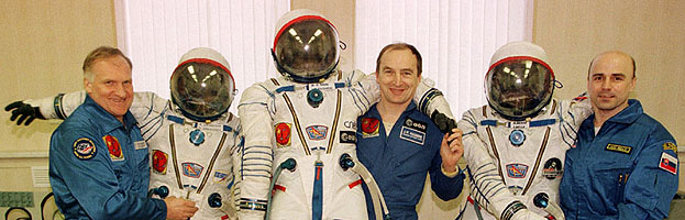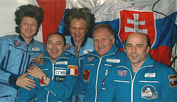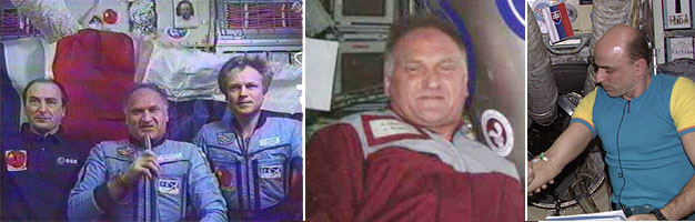 Left: The TM-29 crew in PK-14 suits, together with the Mir-26 crew. Right: Afanasyev in his PK-14 suit following landing, wearing the Stefanik patch. Left: Afanasyev and Avdeev in Penguin suits; Haigneré in an Esa-polo. Avdeyev is now also wearing the Perseus patch. Center: Afanasyev in a red "Centaur"-suit. Right: Bella in colorful working clothes.
