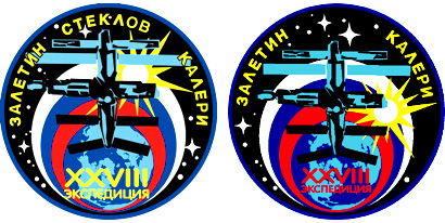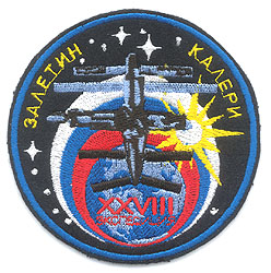 ![]() Left: The first design, showing Steklov's name. The XXVIII is in yellow, the Sun and Mir are placed higher. Right: The final design without Steklov. The Sun and the Mir-station are placed lower to make room for Kaleri's name. Also, the XVIII is in red and the space keft by Steklov is filled with bigger stars. In the rotating Planeta Zemlja/Spaceview partnership, the TM-30/EO-28 patch was designed again by Dima of Planeta Zemlja. The original design includes the name of actor Steklov, who would fly to Mir to have some scenes of a movie filmed aboard. Steklov ultimately did not fly, so his name was removed from the final artwork. The patch was produced by the Vimpel-company and embroidered onto black felt. ![]() Left: The crew one day before launch, not wearing the patch. Center, right: Kaleri and Zalyutin during training for later ISS missions, wearing the same flight suit, with patches. The crew were not wearing the patch on their training flight suits until the final moments before launch. They were not wearing it at their press-conference, one day before the mission, but had it attached to their suits on launch day. The crew did not wear the mission patch on their flight Sokols, but were wearing it in orbit on their Centaur-suits.