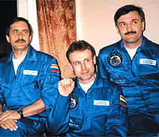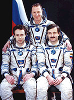![]() Left: The crew in their training Sokols. Center: The crew portrait with Steklov. Right: The crew in their training flight suits, shortly before launch. Back-up crewmember Pavel Vinogradov is visible at left. Mission
