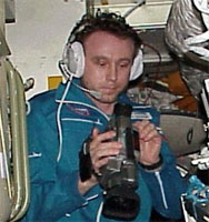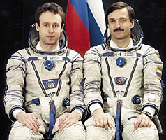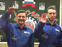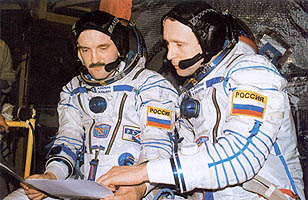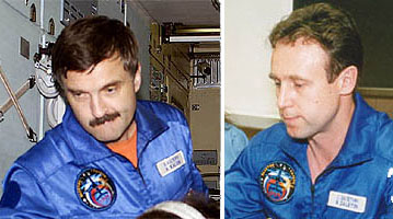 ![]() Left: Kaleri and Zalyutin in their Centaur suits aboard Mir. They are wearing an EO-28 mission patch on their right breast; an Avikos-patch on their left breast.