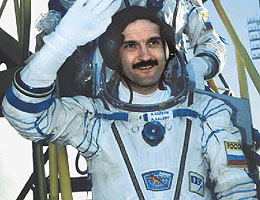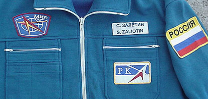 ![]() Left: The crew with their flight Sokols. Right: Kaleri just before launch. Note that there is no mission patch attached to the Sokol and that the Mir-patch is of the newest type, with the "M" out of center to the right.