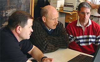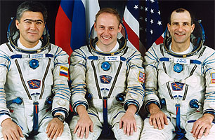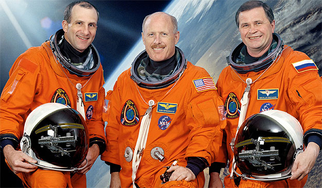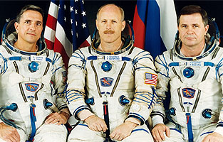 ![]() (ISS006-S-002 - September 2002) --- Astronauts Donald R. Pettit (left), Expedition Six flight engineer; Kenneth D. Bowersox, mission commander; and cosmonaut Nikolai M. Budarin, flight engineer, attired in training versions of the shuttle launch and entry suit, pause from their training schedule for a crew portrait. The three will be launched to the International Space Station (ISS) in late autumn of this year aboard the Space Shuttle Endeavour. Budarin represents Rosaviakosmos.