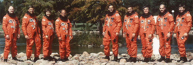 (STS042-S-002) - STS-42 Discovery, Orbiter Vehicle (OV) 103, International Microgravity Laboratory 1 (IML-1) official crew portrait shows crewmembers, wearing launch and entry suits, backdropped against a space shuttle orbiter launch scene. From left to right are Pilot Stephen S. Oswald, Payload Specialist Roberta L. Bondar, Mission Specialist (MS) Norman E. Thagard, Commander Ronald J. Grabe, MS David C. Hilmers, Payload Specialist Ulf D. Merbold, and MS William F. Readdy. The two payload specialists represent Canada (Bondar) and the European Space Agency (ESA) (Merbold).