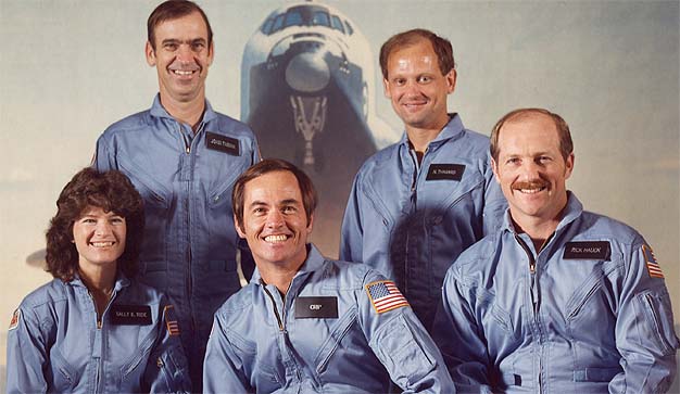 ![]() STS-7 Crew, Commander Robert L. Crippen, Pilot Frederick H. Hauck and Mission Specialists John M. Fabian, Sally K. Ride and Norman E. Thagard.