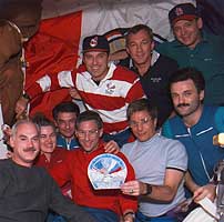 (STS79-E-5243 - 21 September 1996) --- For the second time in its 17-flight career, the Space Shuttle Atlantis is host for at least nine space travelers, as the STS-79 and Mir-22 crew members pose with the flight insignia on the mid deck. From the left: astronaut William F. Readdy, STS-79 commander; astronaut and former cosmonaut guest researcher Shannon W. Lucid; cosmonaut Valery G. Korzun, Mir-22 commander; astronaut Jerome (Jay) Apt, mission specialist; astronaut Carl E. Walz, mission specialist; astronaut John E. Blaha, current cosmonaut guest researcher; astronaut Terrence W. Wilcutt, pilot; cosmonaut Aleksandr Y. Kaleri, Mir-22 flight engineer; and astronaut Thomas D. Akers, mission specialist.
