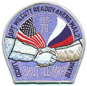 (STS079-S-001 - April 1996) --- STS-79 is the fourth in a series of NASA docking missions to the Russian Mir Space Station, leading up to the construction and operation of the International Space Station (ISS). As the first flight of the Spacehab Double Module, STS-79 encompasses research, test and evaluation of ISS, as well as logistics resupply for the Mir Space Station. STS-79 is also the first NASA-Mir American crew member exchange mission, with John E. Blaha (NASA-Mir-3) replacing Shannon W. Lucid (NASA-Mir-2) aboard the Mir Space Station. The lettering of their names either up or down denotes transport up to the Mir Space Station or return to Earth on STS-79. The patch is in the shape of the Space Shuttle's airlock hatch, symbolizing the gateway to international cooperation in space. The patch illustrates the historic cooperation between the United States and Russia in space. With the flags of Russia and the United States as a backdrop, the handshake of Extravehicular Mobility Unit (EMU) - suited crew members symbolizes mission teamwork, not only of the crew members but also the teamwork between both countries' space personnel in science, engineering, medicine and logistics.