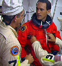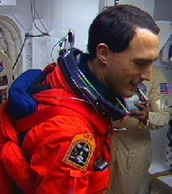 ![]() Astronaut Jim Newman suiting up for the second launch atempt of STS-88.