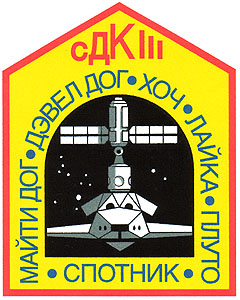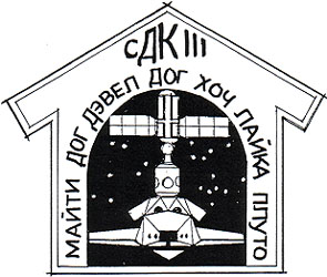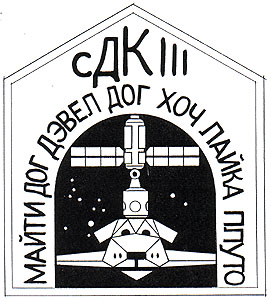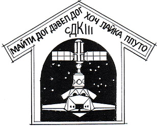 The "stealth concept" charged me to develop a patch that would not be obvious to the casual observer, a sort of mysterious, hard to figure out collection of shapes, text, and colors. The shape of the patch itself is that of a doghouse with a peaked roof. There is a typical doghouse door cutout in the center revealing a stealthy (F117-like) orbiter flying directly at you, upon closer inspection, the orbiter may reveal itself to be a dog's face. The ISS stack in the payload bay consists of the Russian built "Zarya" control module and the U.S built "Unity" module. The star constellations in the space around the orbiter are Canis Major (the Large Dog) and Canis Minor (the Small Dog). The typography on the patch is Cyrillic, the Russian alphabet, which contributes to the stealth theme. The red letters at the peak of the roof translate to SDC III (Stealth Dog Crew III) while the blue letters that surround the door are the crew's dog tags. Clockwise from the lower left: Mighty Dog, Devil Dog, Hooch, Laika, Pluto, and Spotnik (at the bottom of the door).