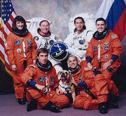 Dave Walker's next command was STS-69 and along with payload commander James "Dogface" Voss, also a member of the STS-53 litter, they put together the Dog Crew II. Rounding out the rest of the pack was shuttle pilot Kenneth "Cujo" Cockrell; mission specialist James "Pluto" Newman; and mission specialist Michael "Underdog" Gernhardt. The STS-69 crew decided that just having a Dog name was not enough, so Ken Havekotte of SpaceCoast Cover Service was contacted to help produce a patch. Ken called me and asked if I would do the design work and a few weeks later the Dog Crew II patch was being walked around NASA on the arms of the astronaut’s flight suits. This was the first time that an unofficial patch has been worn on these suits. In January 1997, Jim "Pluto" Newman wrote a letter to me and posed the idea of yet another Dog Crew, however because some of the management at NASA thought that the concept detracted from the seriousness and importance of space flight, he thought perhaps we should develop a "stealt" patch......Stealth Dog Crew III. Their mission will be STS-88, a high profile flight, it will be the first assembly mission for the International Space Station. The commander is Robert "Mighty Dog" Cabana, a member of the original STS-53 Dog Crew litter. Joining "Pluto" and "Mighty Dog" will be shuttle pilot Rick "Devil Dog" Sturckow; mission specialist Jerry "Hooch" Ross; mission specialist Nancy "Laika" Currie; and the newest arrival, cosmonaut Sergei "Spotnik" Krikalev. (As a side note, the idea for the dog tag "Spotnik" came from one of my co-workers, Lia Jordan. I passed the name along to Newman, and after Krikalev was confirmed as a member of the crew, I was told to add the name to the patch.)