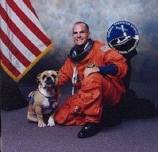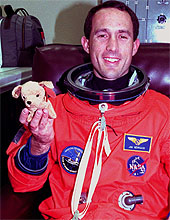 Right: (KSC-98PC-1758 - 03 12 1998) - KSC, In the Operations and Checkout Building, STS-88 Mission Specialist James H. Newman takes part in a complete suit check before launch. Newman holds a toy dog, "Pluto," representing the crew nickname Dog Crew 3 and Newman's nickname, Pluto.