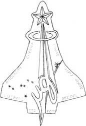 In the summer of 2001, I was asked by Laurel Clark and Dr. Kalpana Chawla to assist in the design of the mission patch for their flight. The crew brought me over to their office, bought some pizzas, and we had fun working the patch. The sketch you see (above) was my input, which then went back to Laurel...who took it to the JSC graphics group so they could make it in to color. Some slight changes were made, namely to keep the production costs down...the bumps on my drawing that penetrate out of the shuttle shape are an example of this. I'm not sure that most people are aware that there is a Star of David in the constellation "Columba" on the left wing. It's not visible on the patch but it is in the graphic. This also shows in my sketch. Thanks to Rich Dann, May 2003. Photo credit of the sketch: Rich Dann, used with permission.