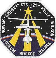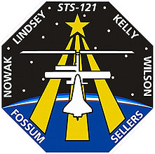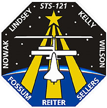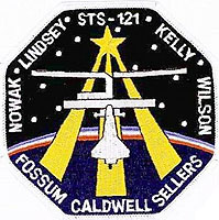 (STS121-S-001, June 2005) --- The STS-121 patch depicts the Space Shuttle Atlantis docked with the International Space Station (ISS) in the foreground, overlaying the astronaut symbol with three gold columns and a gold star. The ISS is shown in the configuration that it will be in during the STS-121 mission. The background shows the nighttime Earth with a dawn breaking over the horizon. STS-121, ISS mission ULF1.1, is the final Shuttle Return to Flight test mission. This utilization and logistics flight will bring a multipurpose logistics module (MPLM) to the ISS with several thousand pounds of new supplies and experiments. In addition, some new orbital replacement units (ORUs) will be delivered and stowed externally on ISS on a special pallet. These ORUs are spares for critical machinery located on the outside of the ISS. During this mission the crew will also carry out testing of Shuttle inspection and repair hardware, as well as evaluate operational techniques and concepts for conducting on-orbit inspection and repair.
