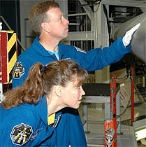 Left: (STS121-S002, 04 January 2005) --- These six astronauts take a break from training to pose for the STS-121 crew portrait. From the left are astronaut Stephanie D. Wilson, Michael E. Fossum, both mission specialists; Steven W. Lindsey, commander; Piers J. Sellers, mission specialist; Mark E. Kelly, pilot; and Lisa M. Nowak, mission specialist.