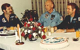 3 members of the STS-8 crew during their pre launch meal. In front of astronaut Dale Gardner is the STS-8 eyes cake.