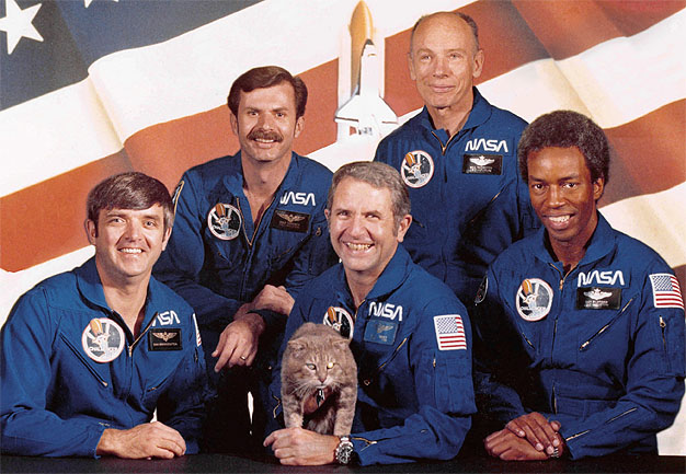 ![]() The STS-8 crew in a funny pose.